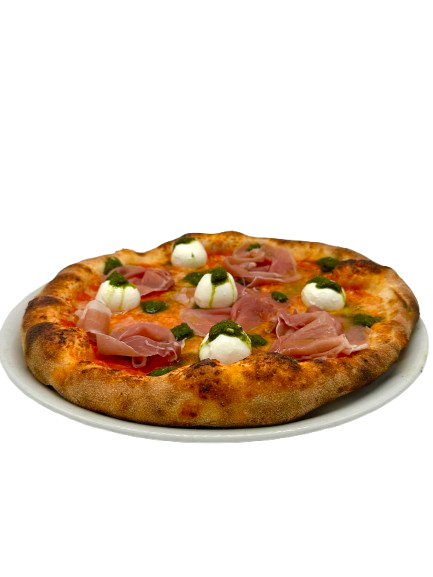 18,50€Pesto, Mozzarella di Bufala, Bauchspeck, Cherrytomaten, Parmesan, Burrata, Basilikum